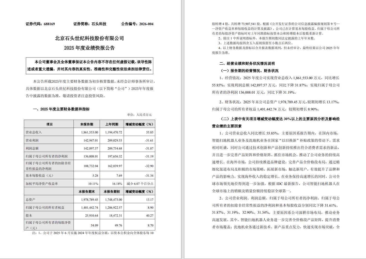 石头科技最新发布的业绩快报显示,2025年公司经营呈现营收增长与利润承压并行的态势。全年实现营业总收入186.16亿元,同比增幅达55.85%,但归属于母公司股东的净利润为13.6亿元,较上年同期下降31.19%,基本每股收益5.28元。这一数据反映出企业在规模扩张过程中面临的阶段性挑战。